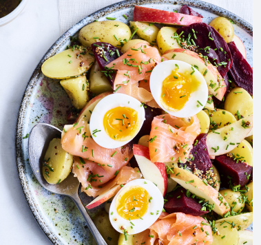 Mâche, saumon fumé, pommes de terre grenailles rôties au four, oeuf mollet, fromage blanc échalote/ciboulette, radis rose, concombre, vinaigrette