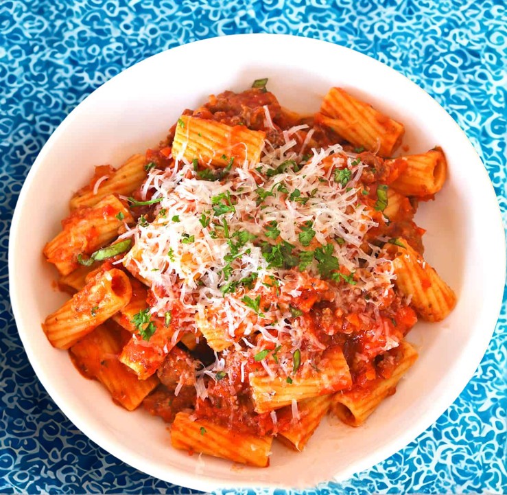 Rigatoni, viande haché de bœuf, sauce tomate parfumé au basilic, parmesan rappé