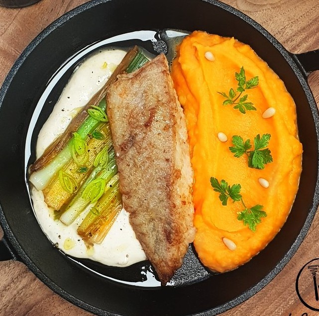 Dos de lieu noir, purée onctueuse de carotte, tronçons de poireaux snackées et sauce citronnée