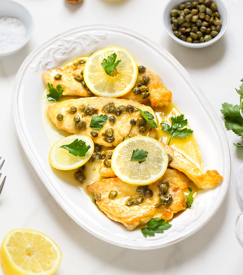 Filet de poulet, bouillon de volaille, sauce parfumé au citron jaune, persil frais, câpres, poêlées de légumes de saison