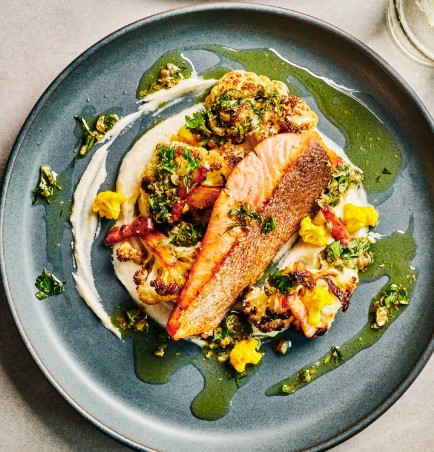 Pavé de truite poêlé au beurre noisette, mousseline de choux fleur, choux fleur rôti au curry et persillade d’herbes fraiches