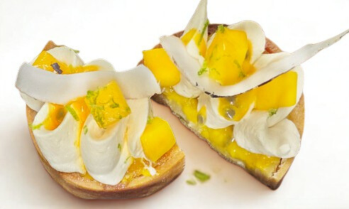 Pâte sablée, crème d’amande, ananas frais, compotée de mangue, ganache montée coco, cube de mangue et fruit de la passion, zeste de citron vert, copeaux de noix de coco fraiche