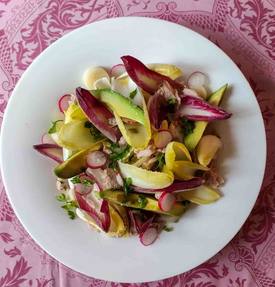 Salade d’endives au thon, maïs, radis rond rose, noisettes grillées
